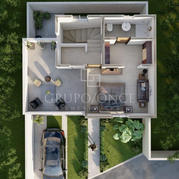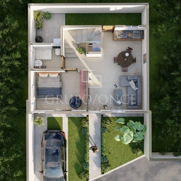 En planta baja encontrarás el área social con sala, comedor y cocina, un baño completo, patio de servicio y espacio adicional para jardín, brindando versatilidad y ventilación natural. Además una recamara con área para closet.
