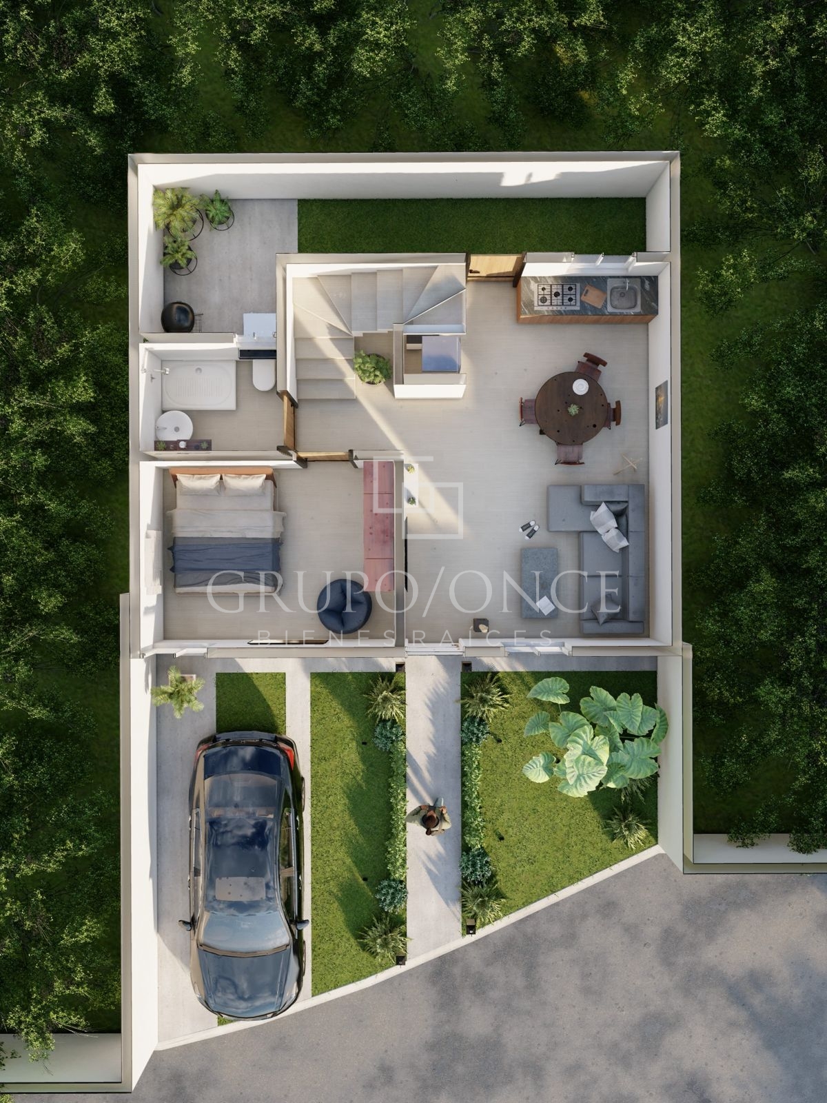 Desde el acceso, la propiedad cuenta con cochera para un vehículo y jardín frontal que aporta una agradable bienvenida.